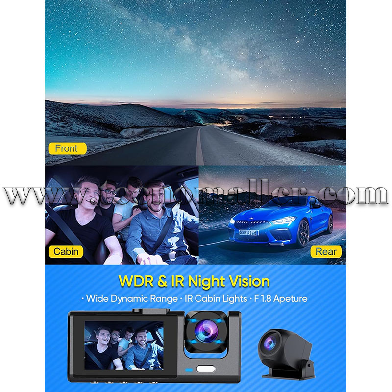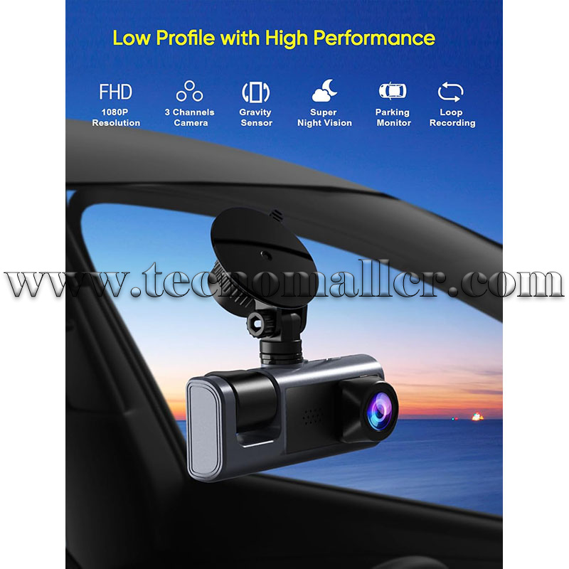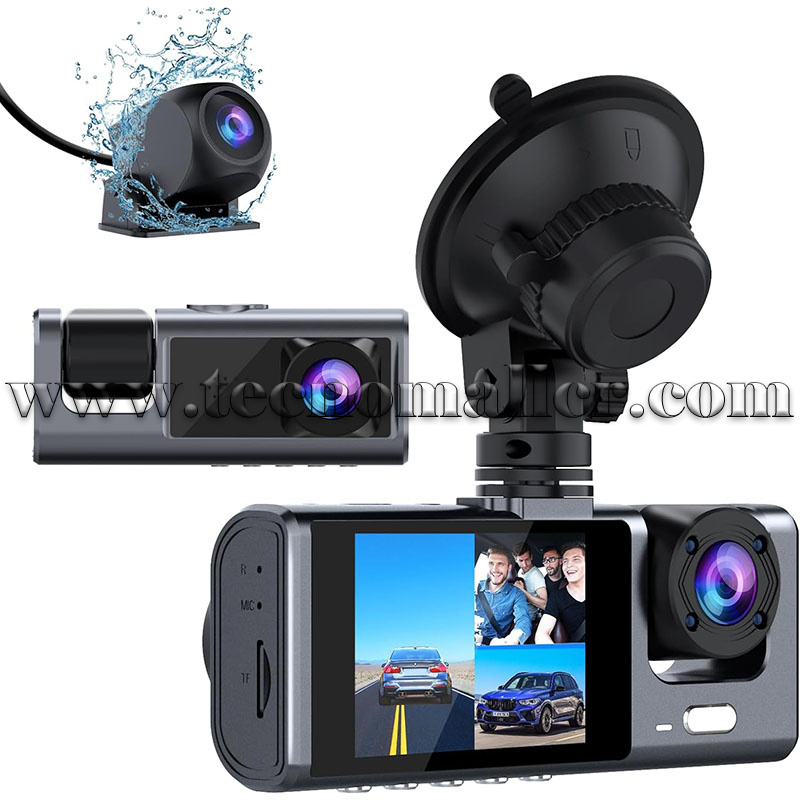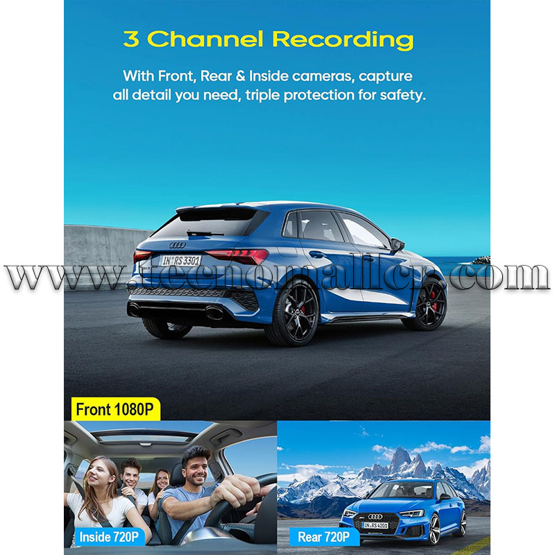 Cámara de tablero frontal y trasera de 1080P en el interior con pantalla HD: chipset Novatek de alto rendimiento y sensor Sony, ayudan a ofrecer video frontal 1080P suave + video interior de cabina de 720P + video trasero 720P. Los videos de 3 canales se muestran en la pantalla IPS que te dan retroalimentación de video en tiempo en vivo de 3 lados de tu automóvil.