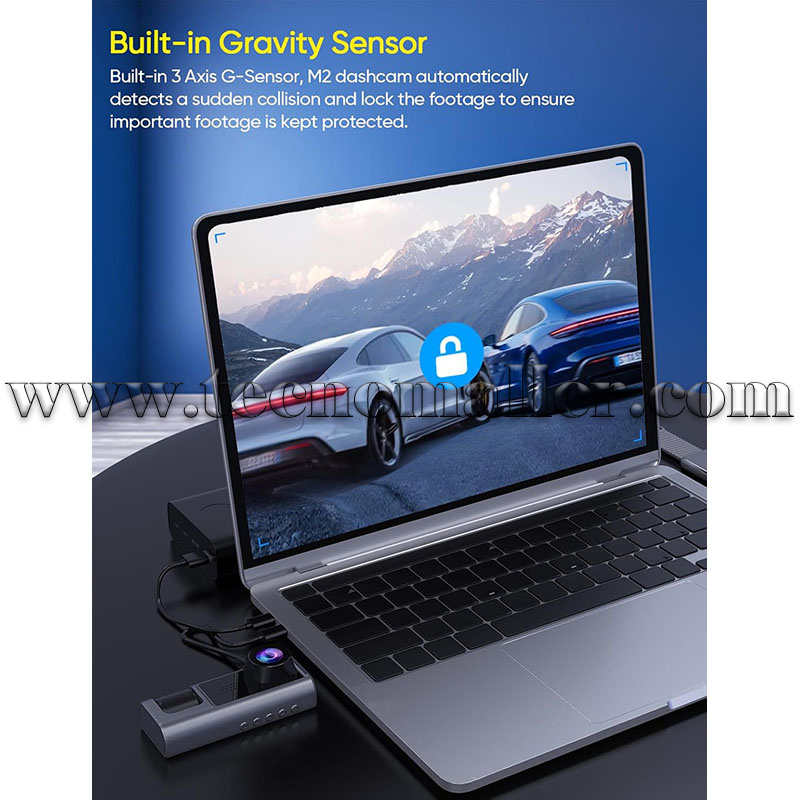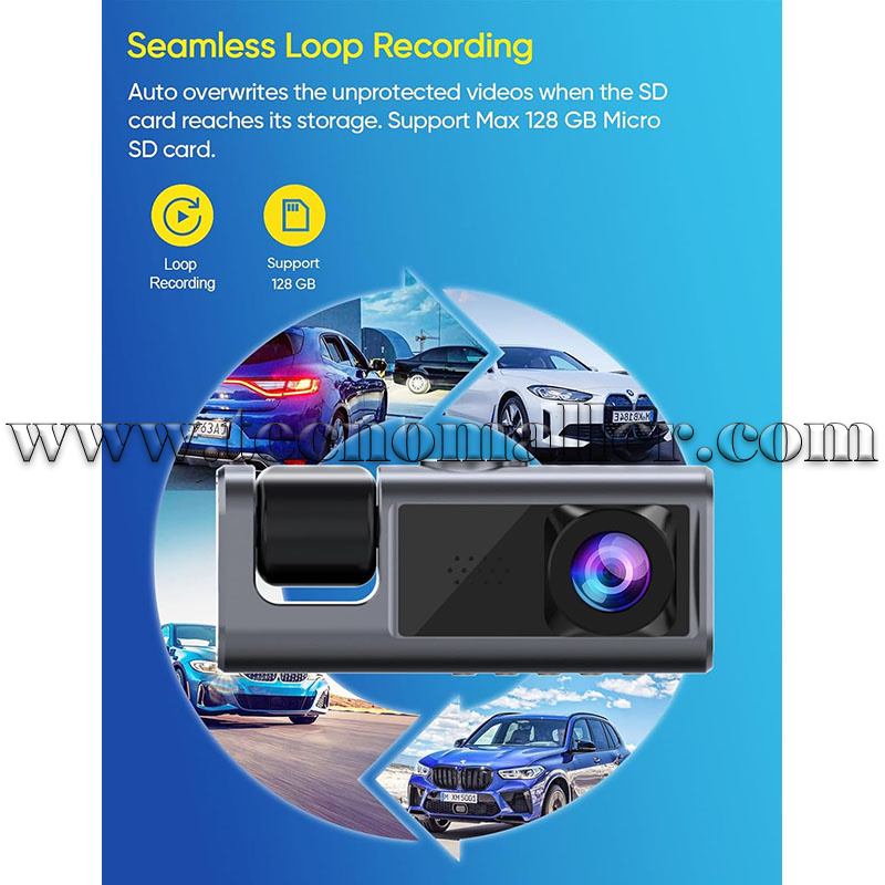 Guarda automáticamente las imágenes de colisión y grabación en bucle: Sensor de gravedad y choque integrado, luego la cámara del tablero detecta una colisión o un golpe, el sensor bloqueará automáticamente el material de archivo como prueba (archivos protegidos). La función de grabación en bucle puede sobrescribir los archivos desprotegidos más antiguos cuando la tarjeta SD está casi llena.