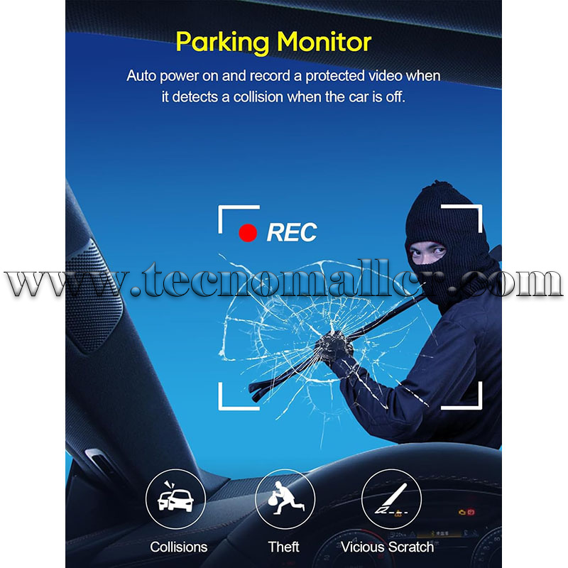 Evidencia de colisiones, robos y arañazos viciosos que ocurren después de que tu automóvil esté estacionado: Monitor de estacionamiento: cuando la cámara del tablero detecta que ocurre una colisión, se encenderá automáticamente y luego grabará un video protegido (no necesita un kit de cableado). Grabación de 24 horas: la cámara de control continuará grabando después de que tu automóvil esté estacionado (necesitas conectarte al kit de cableado, compra ASIN B09SPN811C adicional).