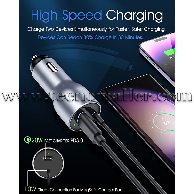 Con el cargador de coche de 30 W, puedes cargar rápidamente dos dispositivos simultáneamente sin ninguna reducción de potencia. Viene equipado con un chip PD3.0, lo que permite una carga rápida. Además, la parte de carga inalámbrica del kit se ha optimizado para evitar el sobrecalentamiento. Esto garantiza la protección de la batería de su teléfono y, en última instancia, prolonga la vida útil de su dispositivo.