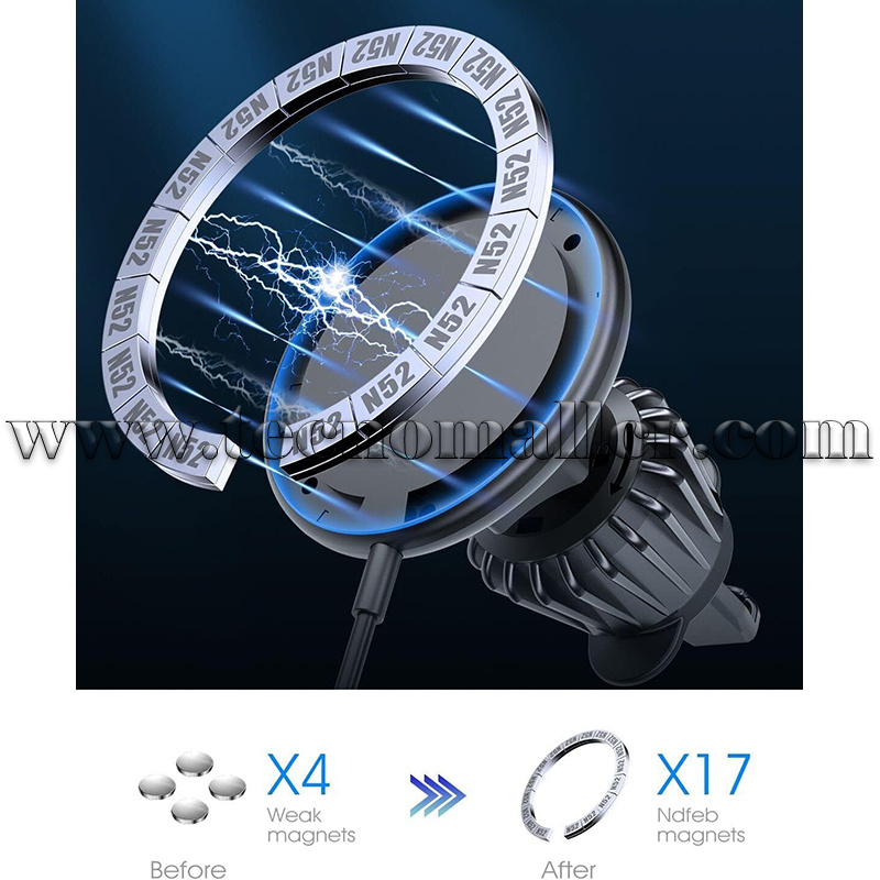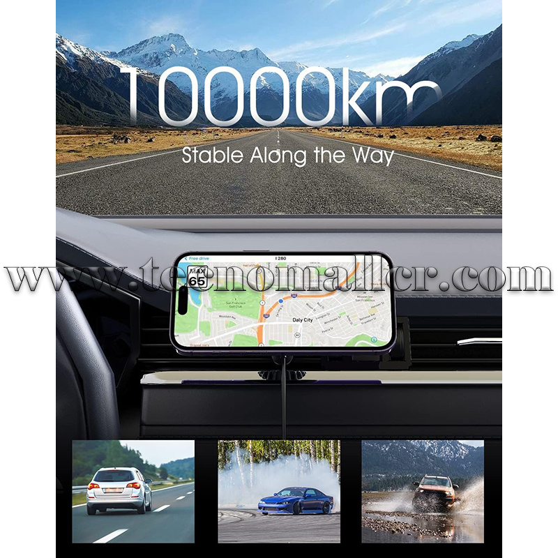 La almohadilla de este soporte magnético inalámbrico para cargador de coche está equipada con 17 imanes de alta resistencia N52, que mantienen de forma segura tu iPhone 15/14/13/12 series en su lugar, incluso en carreteras con baches. Simplemente coloca tu iPhone 15/14/13/12 cerca del cargador de montaje para automóvil Mag-Safe, y se alineará automáticamente con la bobina de carga para una carga estable y rápida.