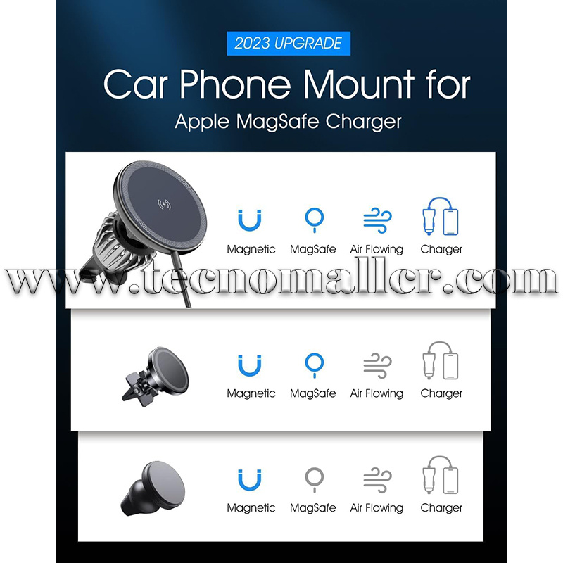 Este dispositivo funciona como un soporte de teléfono de automóvil, cargador inalámbrico y cargador de coche, todo en uno. El soporte magnético inalámbrico para cargador de coche es compatible con iPhone 15/15 Plus/15 Pro/15 Pro Max/14/14 Plus/14 Pro/14 Pro Max/13/13 Pro/13 Pro Max/13 Mini/12. Nota: el cable está conectado al adaptador del encendedor de cigarrillos, que no es desmontable. Por lo tanto, no funciona con automóviles sin el enchufe del encendedor de cigarrillos.