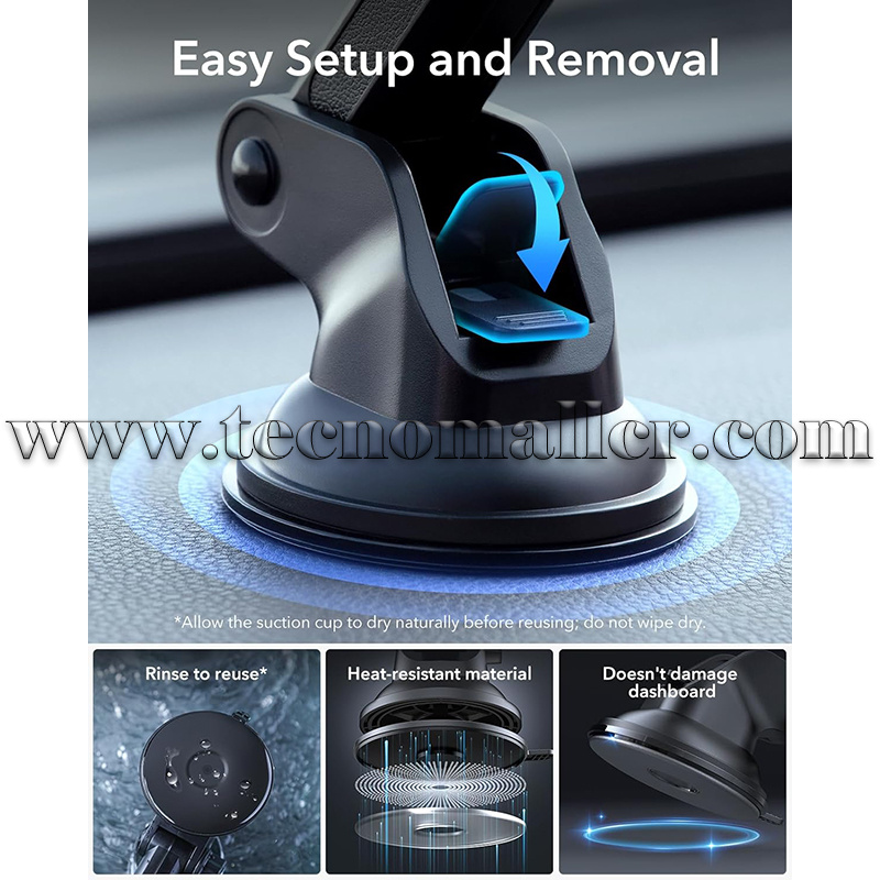 Monta a tu manera: se monta de forma segura en tu tablero o parabrisas con una ventosa reutilizable y una rótula ajustable libremente que te permite encontrar el ángulo más cómodo