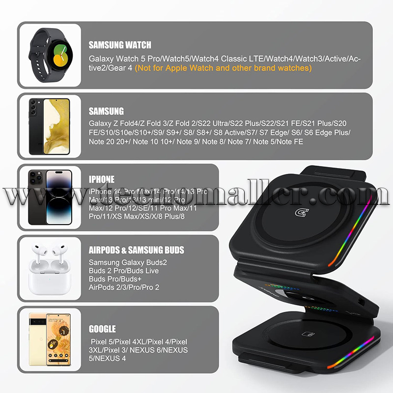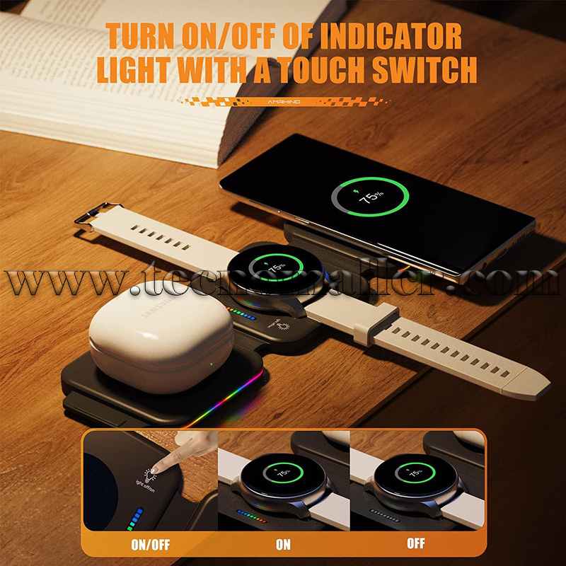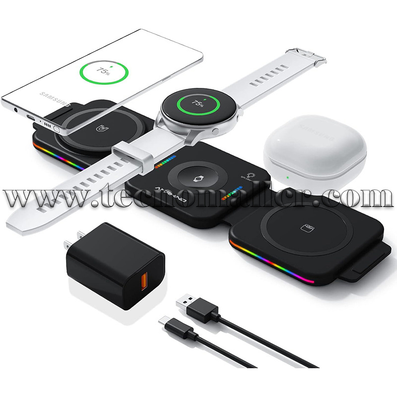 Cargador inalámbrico plegable Amrhino 3 en 1 rápido de 15 W para Celulares y Samsung Galaxy Watch y Buds