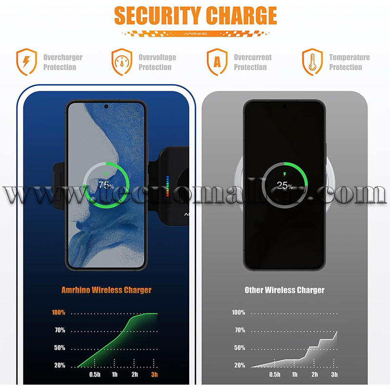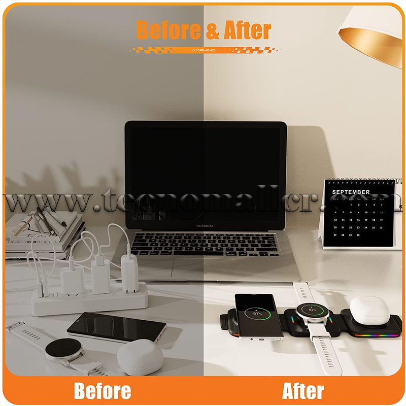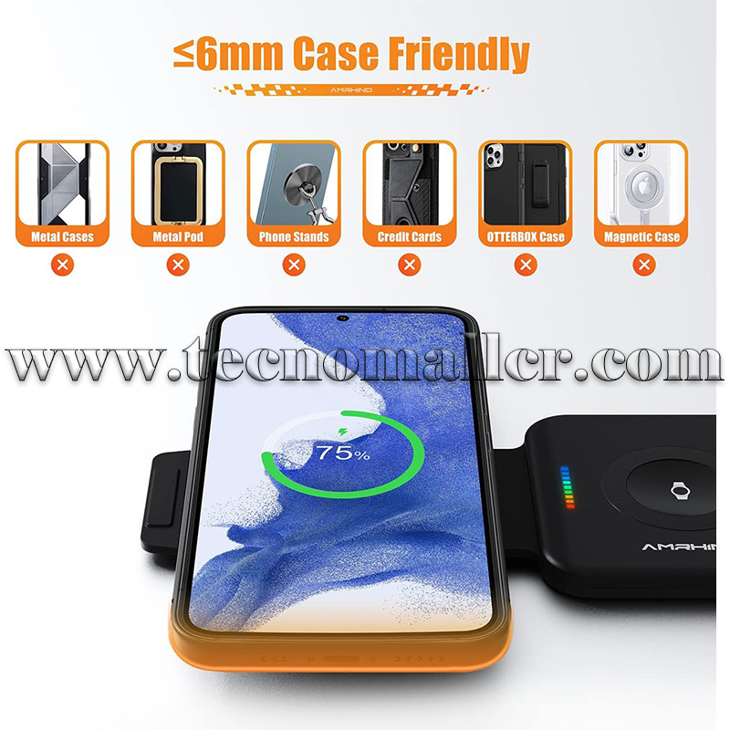 El cargador inalámbrico es compatible con la mayoría de las fundas de teléfono de ≤6 mm. Retira los accesorios metálicos o magnéticos (como soportes para teléfono, tarjetas de crédito, fundas Otterbox o fundas magnéticas) que interfieran con la carga. Incluye: base de carga inalámbrica 3 en 1, adaptador de corriente QC 3.0 de 18 W, cable USB-A a C de 1 m y manual de instrucciones.
