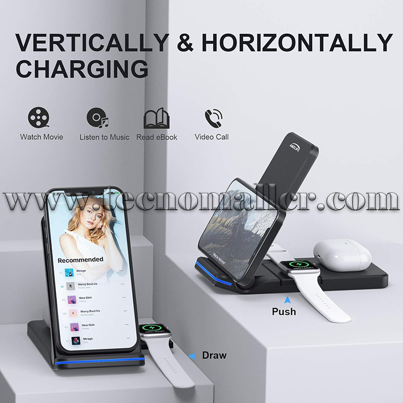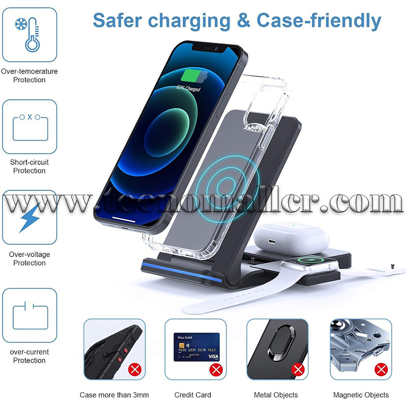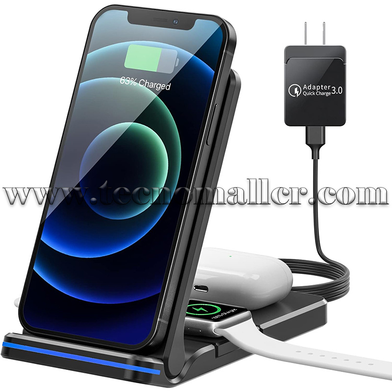 Cargador inalambrico rapido plegable 3 en 1 para telefonos varios, iWatch y AirPods