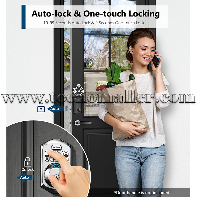 Características de bloqueo inteligente: Ajuste la cerradura automática de la puerta para que se bloquee en 10-99 segundos, y use la función de bloqueo automático de un solo toque presionando y manteniendo presionada cualquier tecla en el teclado durante 2 segundos.
