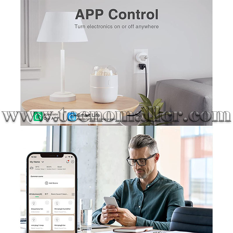 Control remoto de aplicación: controla de forma remota el mini enchufe inteligente a través de la aplicación de tu smartphone cuando vayas a la oficina o de camino a casa. No tienes que preocuparte por olvidarte de encender/apagar los electrodomésticos cuando salgas. Fácil y rápido de encender o apagar el electrodoméstico que está conectado, para ayudarte a ahorrar dinero en facturas de electricidad. Nuestras tomas wifi inteligentes también son compatibles con la aplicación Smart Life y la aplicación Tuya