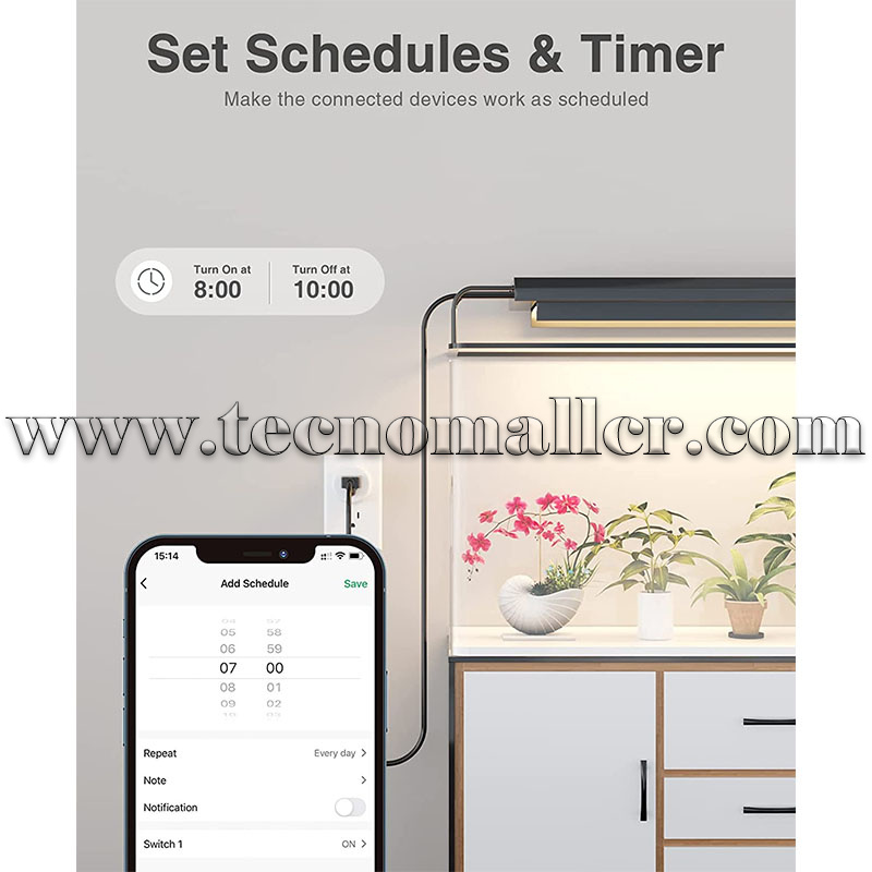 Establece un temporizador para la luz: configura un temporizador y cuenta atrás para tus luces para que se encienda automáticamente por la mañana y se apague por la noche según tu rutina diaria. Programar el tiempo de trabajo para los aparatos de forma aleatoria y circular o establecer la cuenta regresiva a través de la aplicación del teléfono.