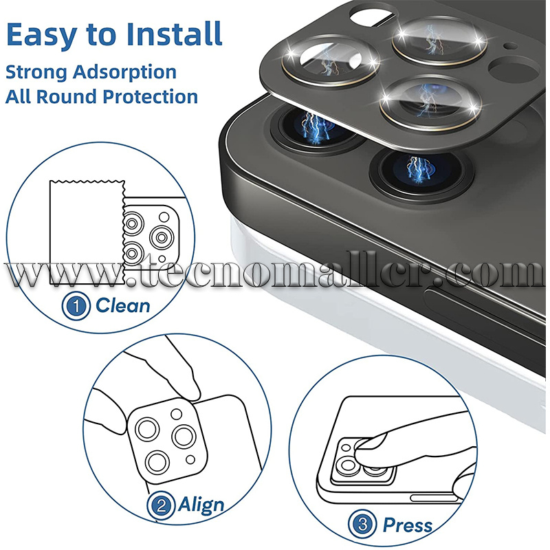 Compatibilidad: el protector de cámara trasera hecho con vidrio templado 9H y aleación de aluminio está diseñado para cada teléfono. El protector de cámara cubre completamente la lente de tu teléfono. Sin burbujas, compatible con fundas, no deja residuos después de quitarlo.