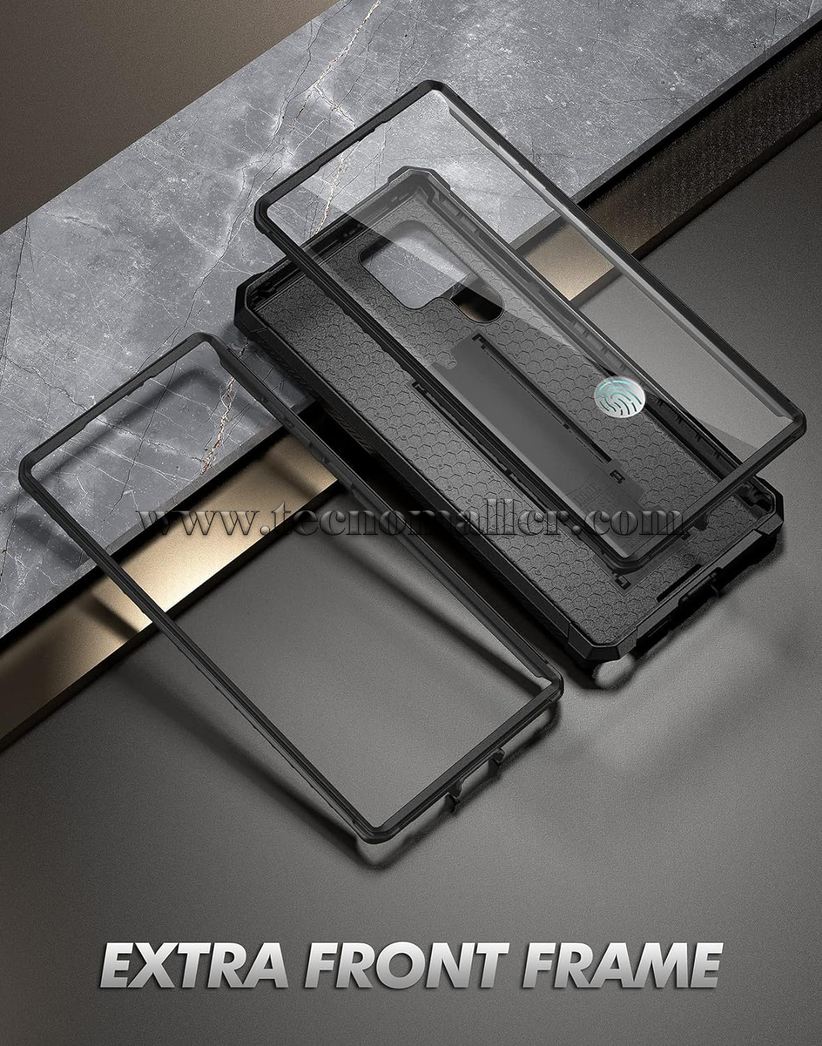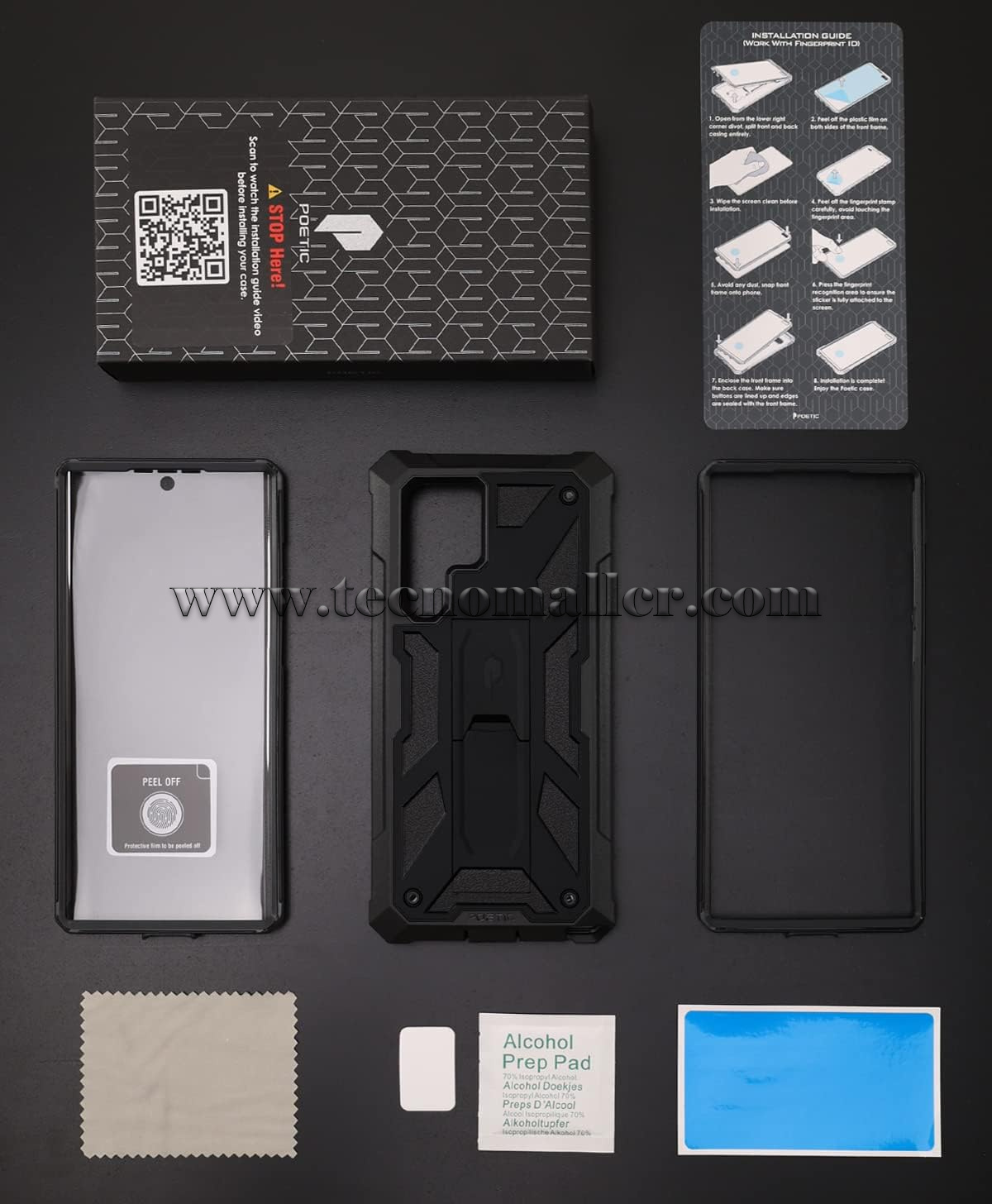 Marco frontal extra (2): para las personas a las que no les gusta utilizar protectores de pantalla integrados, Poetic ha incluido un marco frontal adicional para usar con su propio cristal templado integrado.
