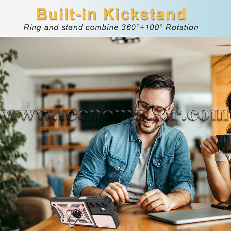 Función de soporte + montaje magnético para el coche: El soporte de anillo integrado en la parte posterior es giratorio de 360 grados, muy conveniente para la visualización de manos libres multiángulo, incluyendo visualización horizontal o vertical. El metal en el centro de la parte trasera permite que esta funda se fije firmemente al soporte magnético del coche (no se incluye el soporte magnético para el coche).