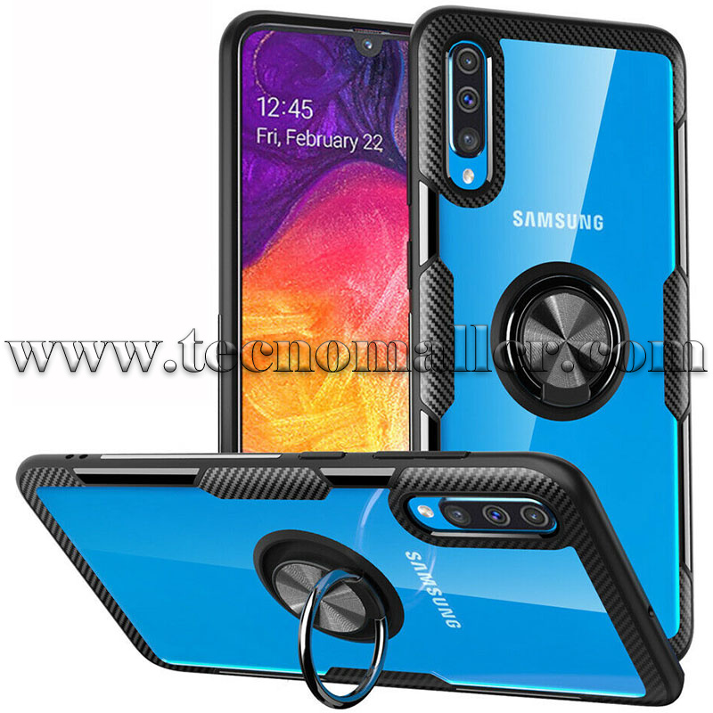 Samsung Galaxy A30s estuche policarbonato transparente y fibra de carbono con anillo magnetico