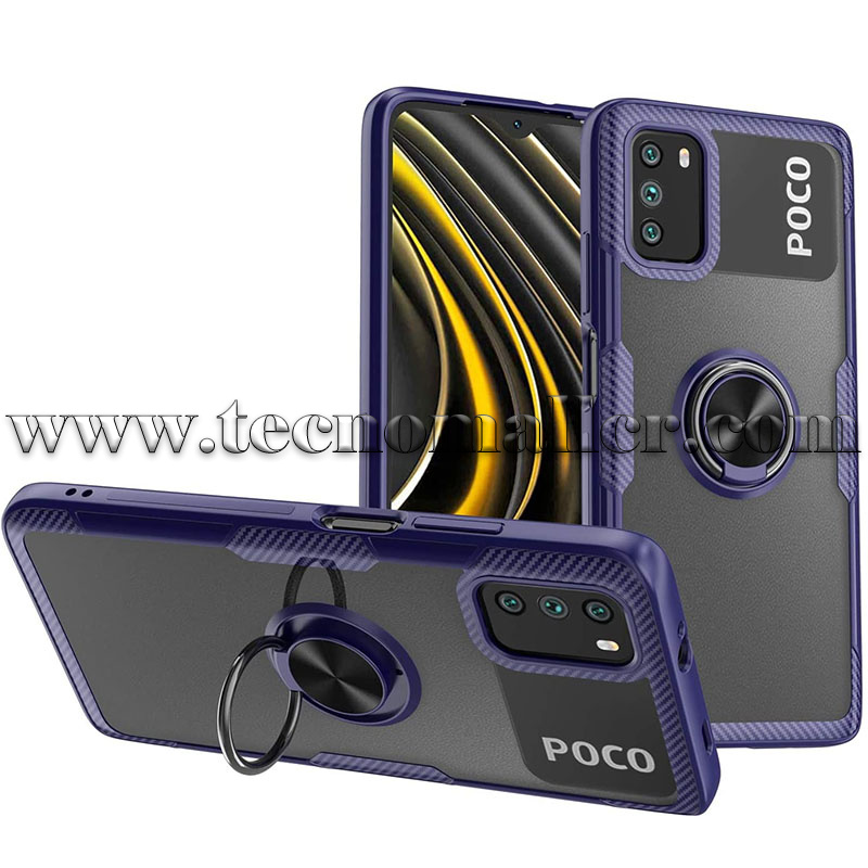 Poco M3 estuche policarbonato transparente y fibra de carbono con anillo magnetico
