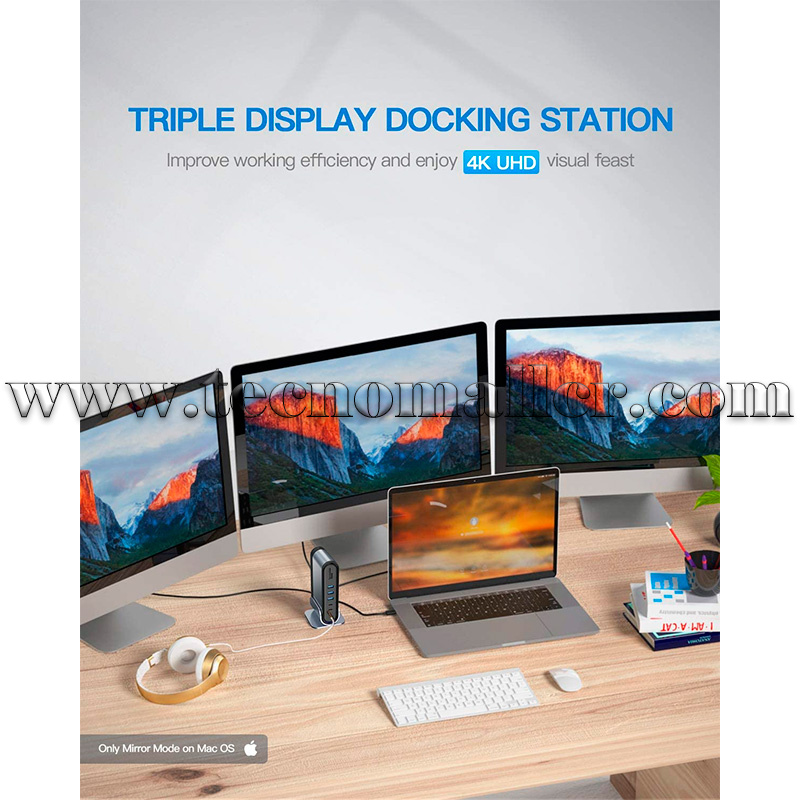Estación de acoplamiento 17 en 1: hasta 16 puertos que te permiten conectar casi todos los dispositivos a través de un solo engranaje; 3 puertos HDMI 4K para lanzar diferentes contenidos en cada pantalla, PD tipo C para conectar dispositivos móviles, 3 puertos USB 3.0, 2 puertos USB 2.0. Nota: la estación de acoplamiento requiere un segundo adaptador de corriente a través del puerto PD USB-C cuando se carga tu portátil a través de él.