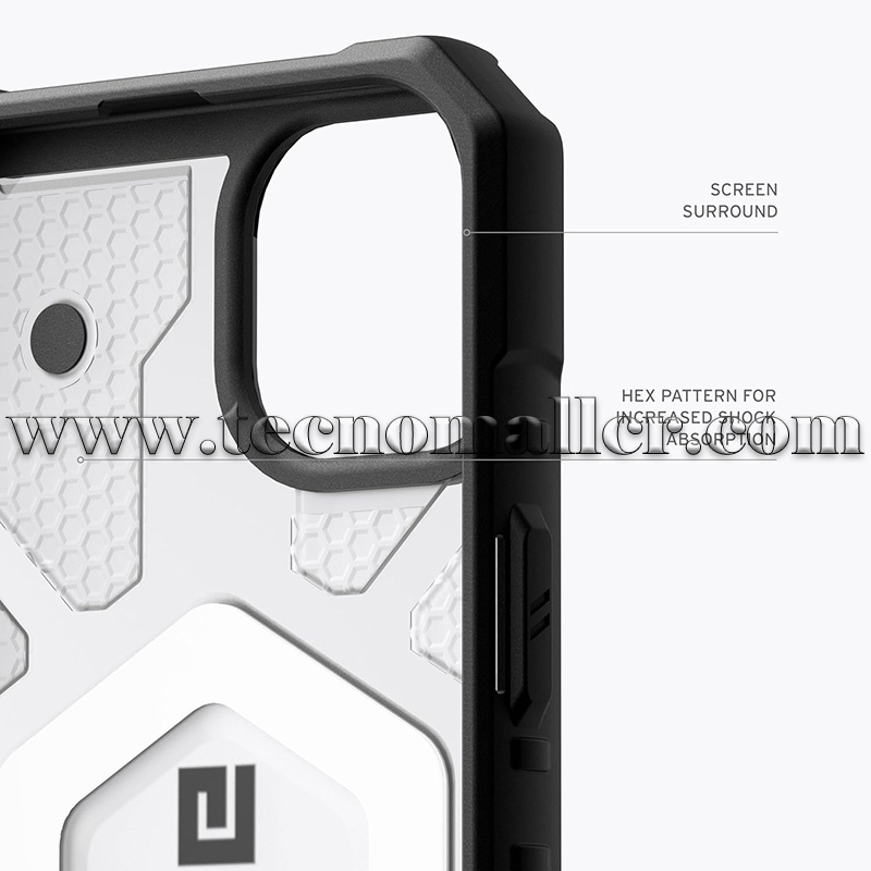 Material ligero: nuestra funda tiene un diseño elevado co-moldeado, construcción compuesta ligera como pluma (policarbonato translúcido) con nuestra carcasa exterior rígida patentada, un núcleo suave resistente a los impactos y detalle de tornillo de torsión. Patrón hexagonal para una mayor absorción de impactos. Fabricado con un 25% de materiales reciclados.